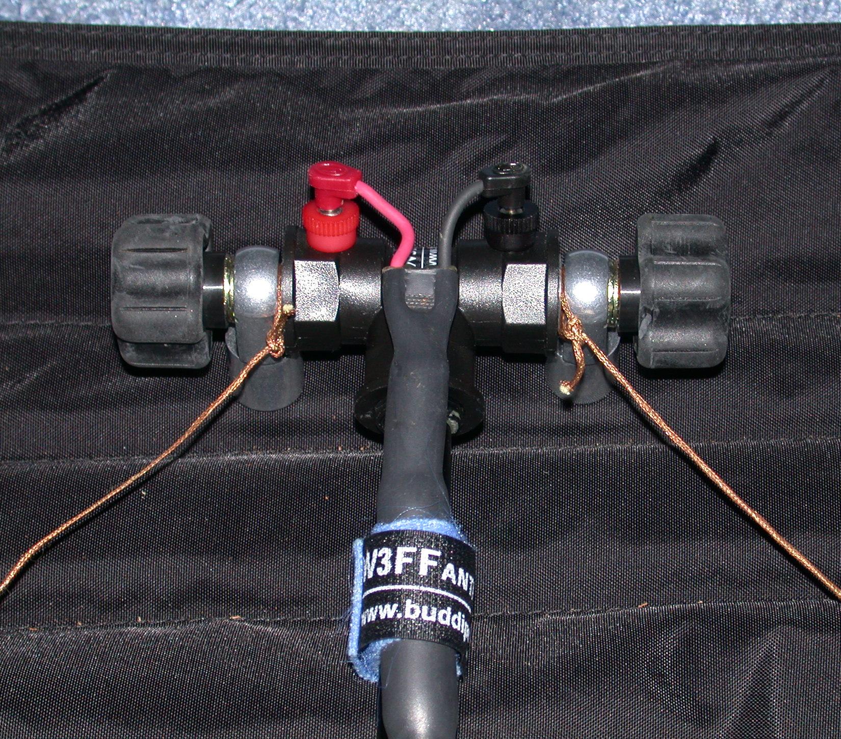 As I already owned the sixteen-foot mast and tripod for my commercial Buddipole (CBP), the thought came to me that perhaps I could use the CBP for the center support to hold up the center of a 15 foot NVIS inverted vee. I then thought that perhaps I could also use the Buddipole Center Tee as the insulator. But how could I attach the wire of the dipole legs? I first thought of using screws and washers, but then realized if the wire was light enough, I could simply form a one inch diameter loop in the wire, slip it over the shaft of the screw of the adjustable arm adapter and use the machined metal fitting of that adapter as the washer against the center conductor!