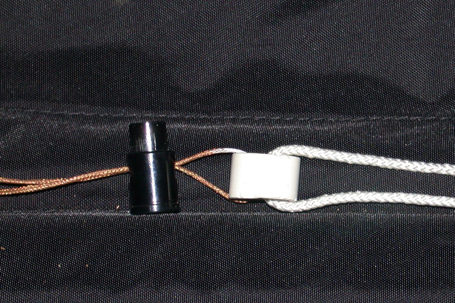 But I didn't want to cut the far ends of the antenna wire for fear of making them too short. I then remembered how another ham had used simple spring loaded cord locks from a camping store to secure the ends of a temporary dipole, but keep it readily adjustable for different bands. By using this method, I could make the same wire function on 80 CW, 75 Phone and 60 meters merely by shortening the antenna wire and wrapping any excess wire back on itself and clamping it when operating on the higher frequencies. This also allows band changes and fine tuning at ground level without having to lower the center support structure.